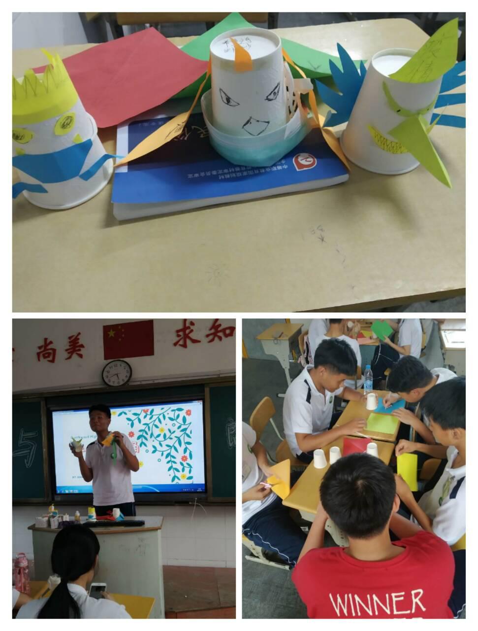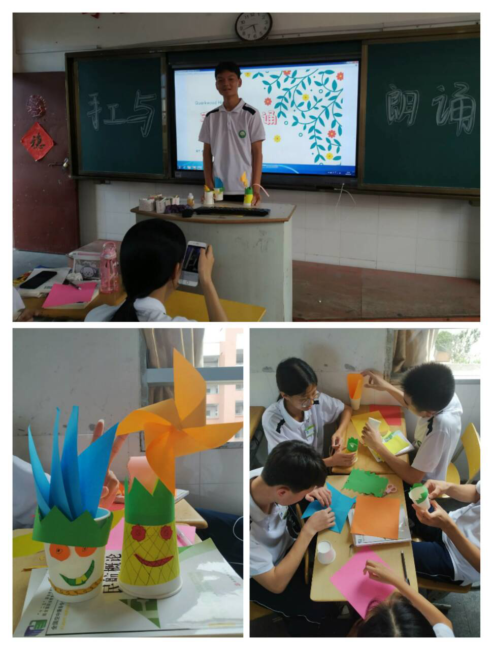 第一组由巫嘉怡同学组织,作品主题为“荷塘月色”。他们利用材料做出最具夏天特色的荷塘,荷塘上开着荷花,青蛙在荷塘中呱呱叫。加上深情的诗文朗诵,让我们感受到习习凉风下,蛙声一片的夏夜之美。