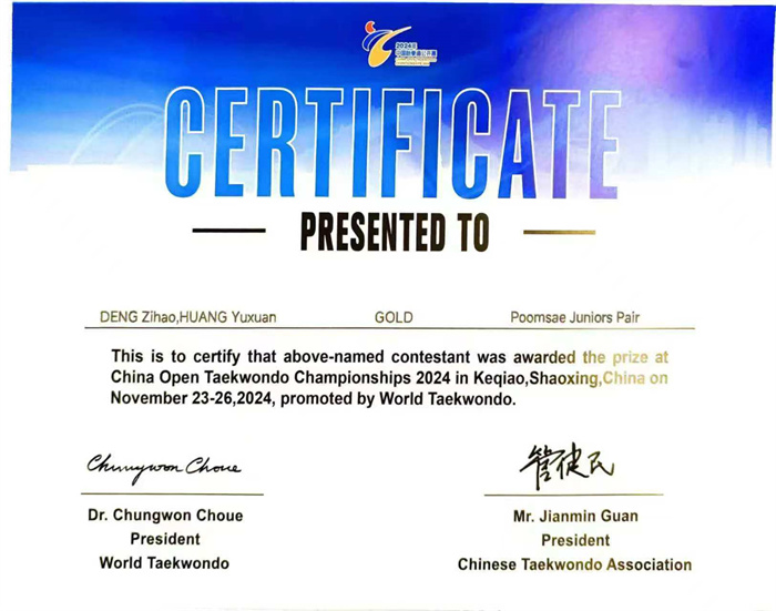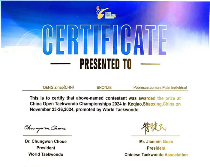 喜报!开元(中国)学生在2024年中国跆拳道公开赛中斩获一金一铜的奖牌