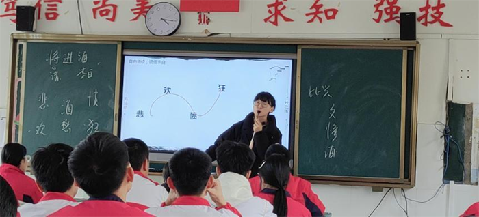 语文组李娴老师《语文—将进酒》,将树立正确三观观、坚定理想信念等思政元素融入语文教学之中,从李白自信乐观的人生观中获得启迪,提高审美情趣、深化对人生的认识,在诵读中渗透理解、渗透点拨,用诵读撬开文本,撑起课堂,实现自然升华,达成教学目标。